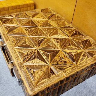 虎竹を高度な技術で同じ三角形のパーツに切り取り製作された、他では見られない竹の使い方をした作品たちがあります。この作品のキモとなっているのは、竹を全く同じ正三角形のパーツに切り出すという工程です。言葉で言うのは簡単ですが、竹という素材を知っている方であれば、これがどれほど大変な作業であるかは想像がつくかと思います。そもそも竹は、均一な素材ではありません、丸い形でさえ、楕円であったり一定の形ではなく、一本一本が身の厚みも違えば、硬さや性質も微妙に異なります。特にやっかいなのは表皮部分です、非常に硬質でガラス質を含んでいるため、安易に鋸を入れると切断面にバリやササクレが出やすいのです。