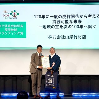 開花が予想されていたように一斉ではなく、数年に渡って徐々に広がっているため、継続的な観察と対応をしています。今まで伐採してこなかったような山深い竹林にも足を運べるよう、山道を新たに整備するなど虎竹の保全活動は待ったなしで進めています。この危機を乗り越え、次の100年へ虎竹を継承することが、老舗竹屋の使命とも言えるかと考えています。今回の「実行委員会特別賞 環境地域ブランディング賞」は、このような未知への挑戦をするボクたちへの応援であるかと思います。本当にありがとうございます。