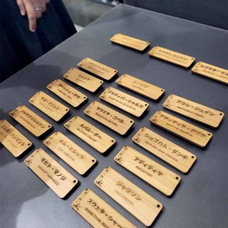 学生たちの思いやりの深さを感じる象徴的な出来事がありました。オープンエレクティブが数日過ぎたある日、二人の学生が竹板にネームプレートを刻印して持ってきてくれました。「ヤマギシ ヨシヒロ」と日本語のカタカナでレーザー刻印されています、竹のワークショップらしく竹の絵まで入っています。